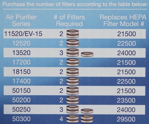 For air purifier models 13520, 50255-HD, 50250(or HEPA filter no. 24000) three HRF-F1 filters are needed.